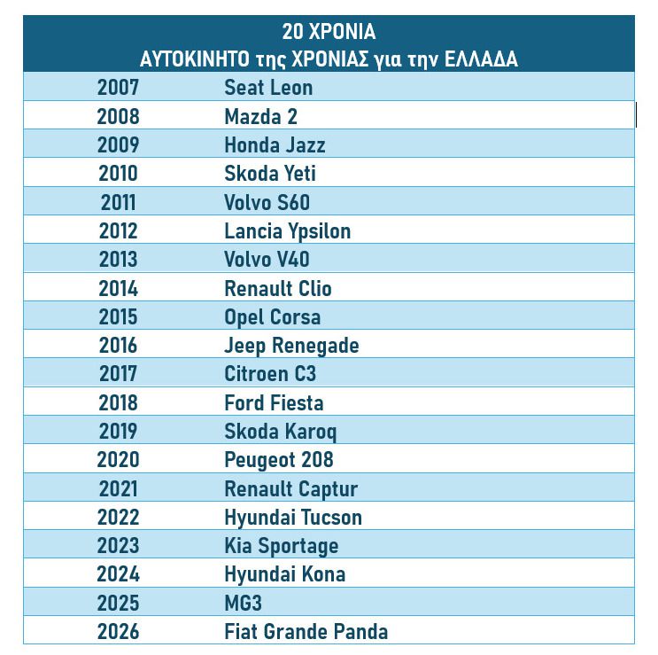 Τα 20 χρόνια συμπληρώνει φέτος το «Αυτοκίνητο της Χρονιάς για την Ελλάδα», του ανεξάρτητου δημοσιογραφικού θεσμού που παρακολουθεί τις εξελίξεις στον χώρο της αυτοκίνησης και αναδεικνύει κάθε χρόνο τις καλύτερες για τον Έλληνα οδηγό-καταναλωτή επιλογές της αγοράς.