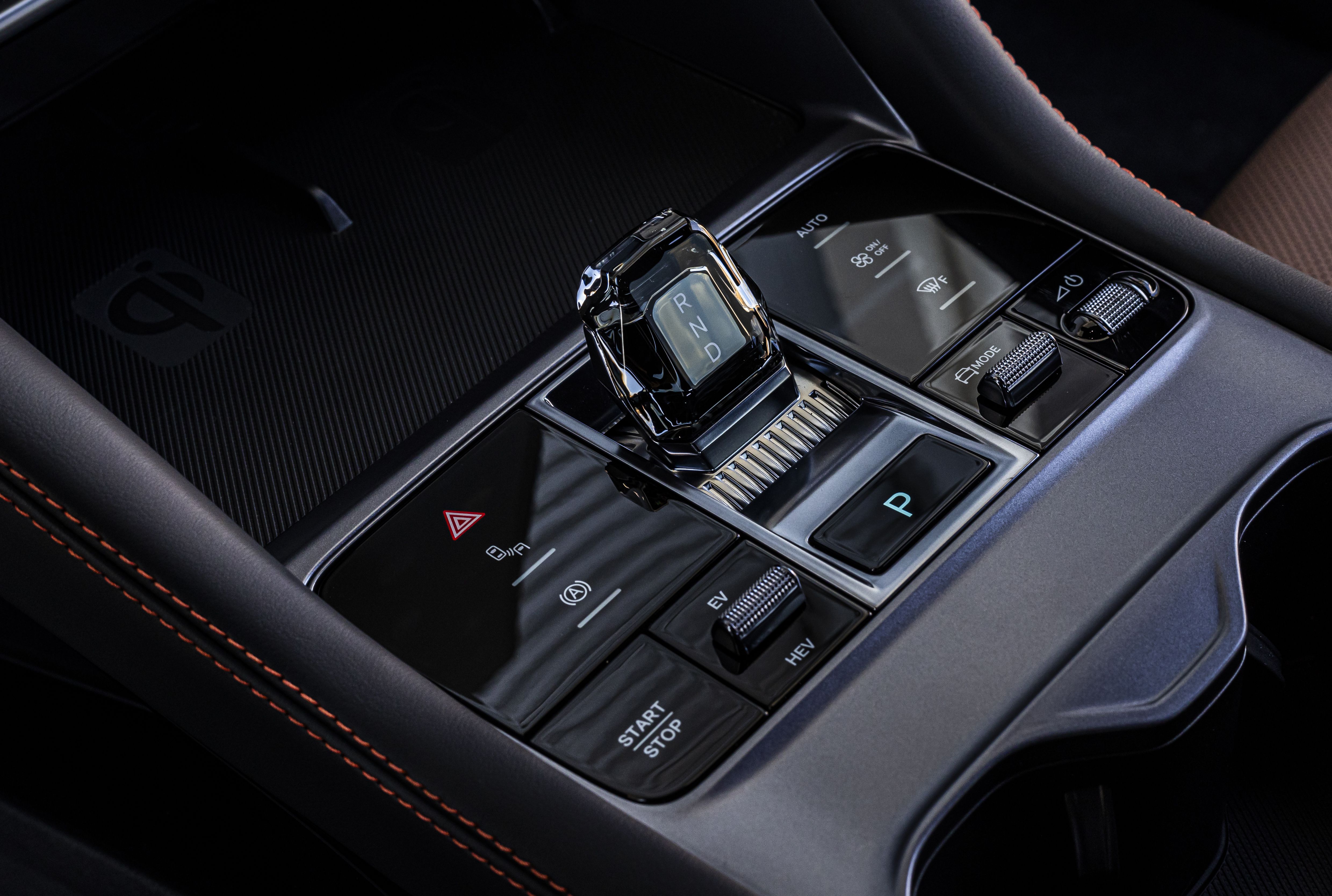 Ο οδηγός και ο συνοδηγός χωρίζονται από μία ογκώδη κεντρική κονσόλα δαπέδου, όπου στο πάνω μέρος φιλοξενεί δύο θέσεις ασύρματης φόρτισης τηλεφώνου ισχύος 15W, την «καρδιά» με τον επιλογέα σχέσεων και τα φυσικά πλήκτρα με τις συντομεύσεις ορισμένων βασικών λειτουργιών (κλιματισμό, προγράμματα οδήγησης, λειτουργία υβριδικού συστήματος κ.α.), δύο ποτηροθήκες και φυσικά το υποβραχιόνιο που κρύβει και έναν μεγάλο χώρο αποθήκευσης. Στο κάτω μέρος υπάρχει ανοιχτός χώρος αποθήκευσης αρκετών αντικειμένων και δύο θύρες φόρτισης και ταχυφόρτισης (έως 60W).
