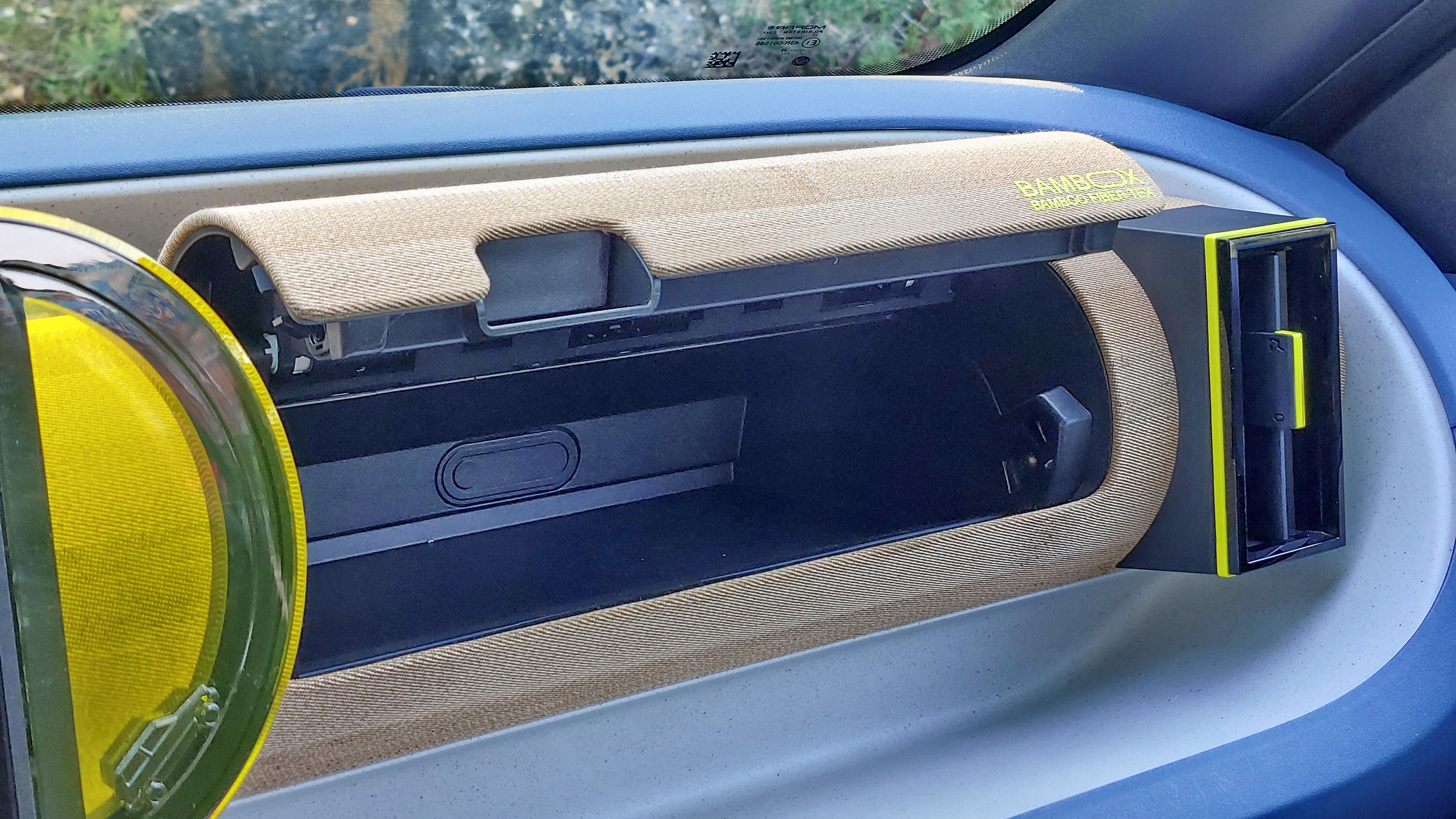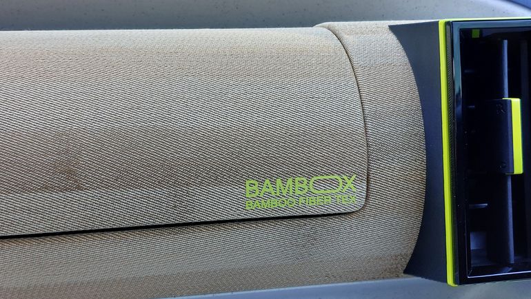 Στην πλούσια έκδοση La Prima, όπως το αυτοκίνητο που δοκιμάζουμε, το ταμπλό διαθέτει και μια μεγάλη διακοσμητική φάσα που αποτελείται κατά 33% από πραγματικές ίνες μπαμπού και προσθέτει έναν ακόμα κλειστό αποθηκευτικό χωρο που ονομάζεται BAMBOX. Οι υπόλοιπες δύο εκδόσεις έχουν ανοιχτό χώρο αποθήκευσης, τύπου ράφι.