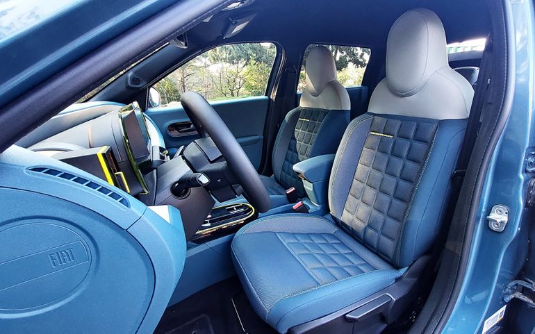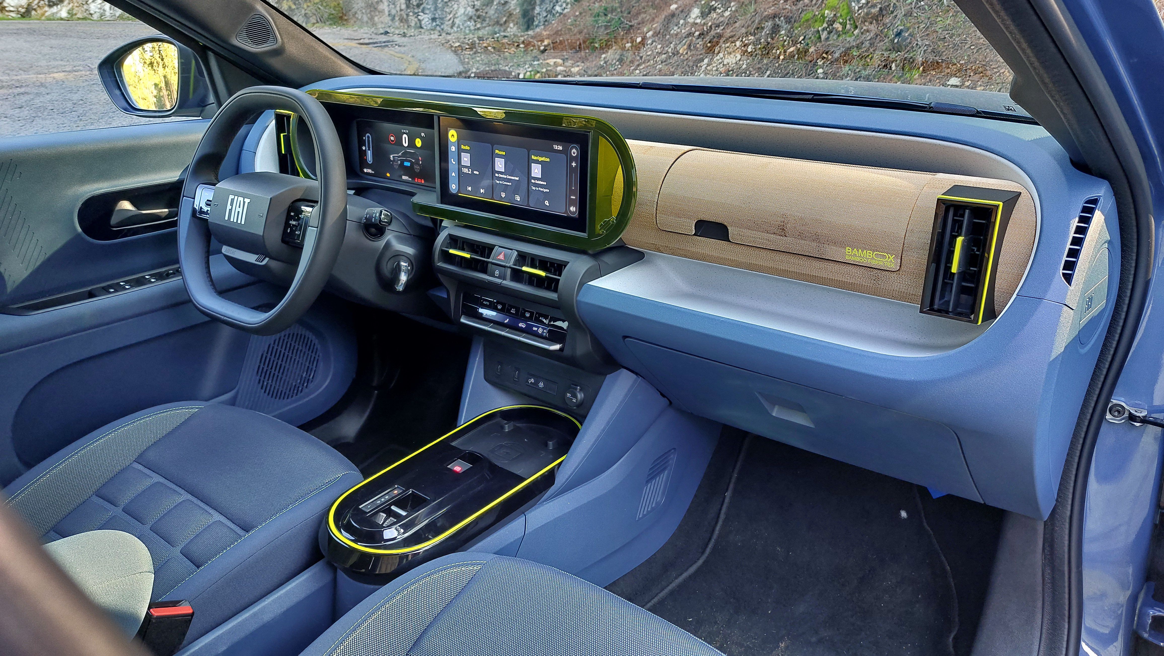 Το πλαστικά που αποτελούν το εσωτερικό του νέου Grande Panda είναι σκληρά με ωραία υφή και έχουν στιβαρή αίσθηση χάρη στο καλό μεταξύ τους μοντάρισμα, δείχνοντας με αυτό τον τροπο ότι θα αντέξουν με το πέρασμα του χρόνου και την έντονη χρήση. Την ίδια ποιοτική αίσθηση έχουν και όλοι οι διακόπτες, ειδικά αυτοί που βρίσκονται πίσω από το τιμόνι. Η επιλογή του χρώματος «Blu Tasmania» δεν έγινε βέβαια τυχαία ή για να κάνει όμορφη αντίθεση με τις κίτρινες λεπτομέρειες, αλλά μαρτυρά το προσεγμένο οικολογικό προφίλ των υλικών που έχουν χρησιμοποιηθεί.