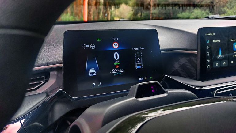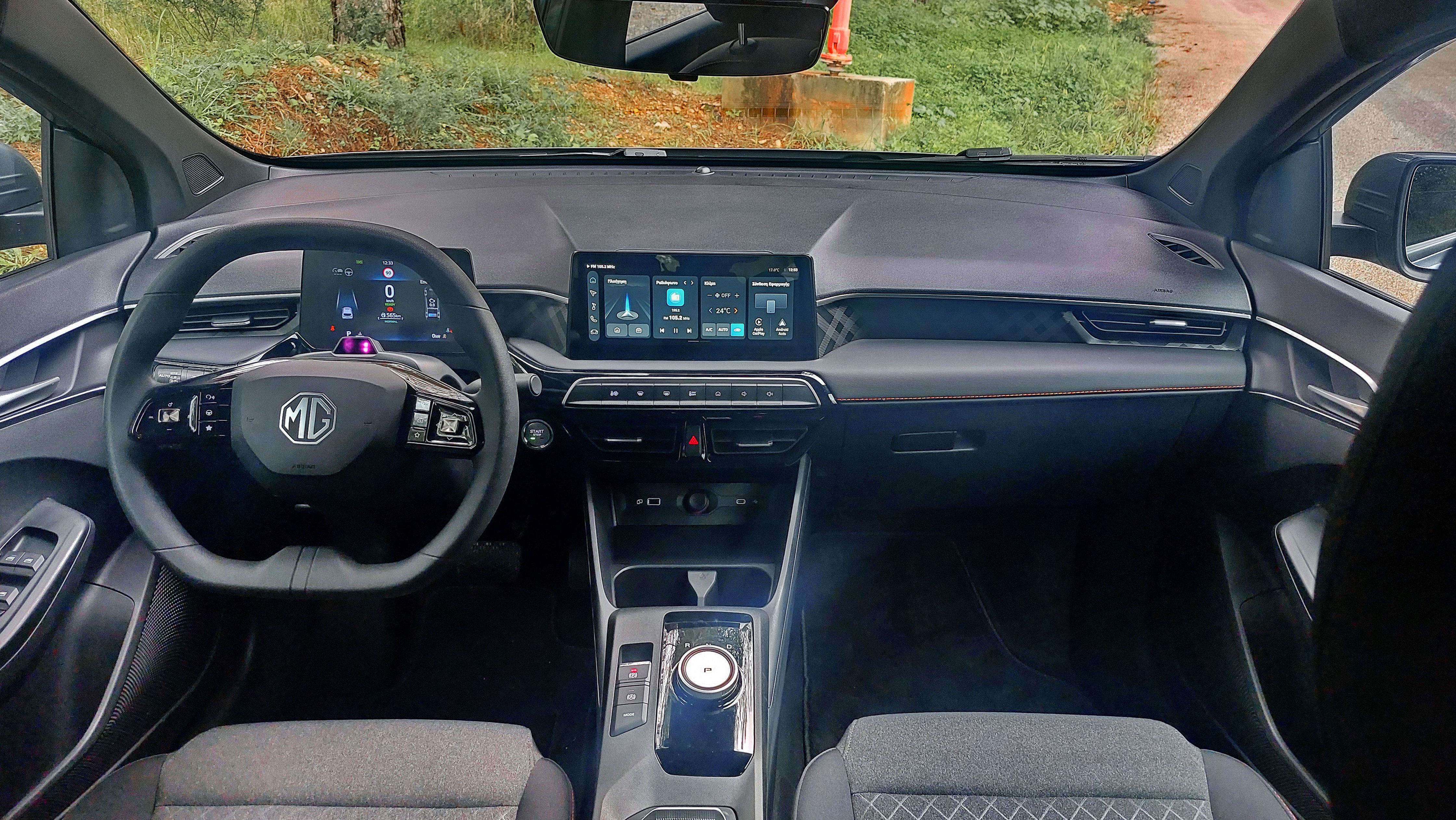 Περνώντας μπροστά, έχουμε να κάνουμε με μια σωστή θέση οδήγησης με καλή ορατότητα περιμετρικά και σωστά μελετημένη εργονομία. Το τιμόνι έχει όμορφο σχήμα και εύχρηστους διακόπτες, οι οποίοι αναλαμβάνουν πολλούς ρόλους. Αυτοί που βρίσκονται στο αριστερό μπράτσο είναι για το Adaptive Cruise Control, ενώ εκείνοι στα δεξιά χειρίζονται τόσο τον πλήρως ψηφιακό πίνακα οργάνων 7’’ που διακρίνεται για την πληθώρα ενδείξεων, όσο και την κεντρική οθόνη αφής 10,25’’ του infotainment.