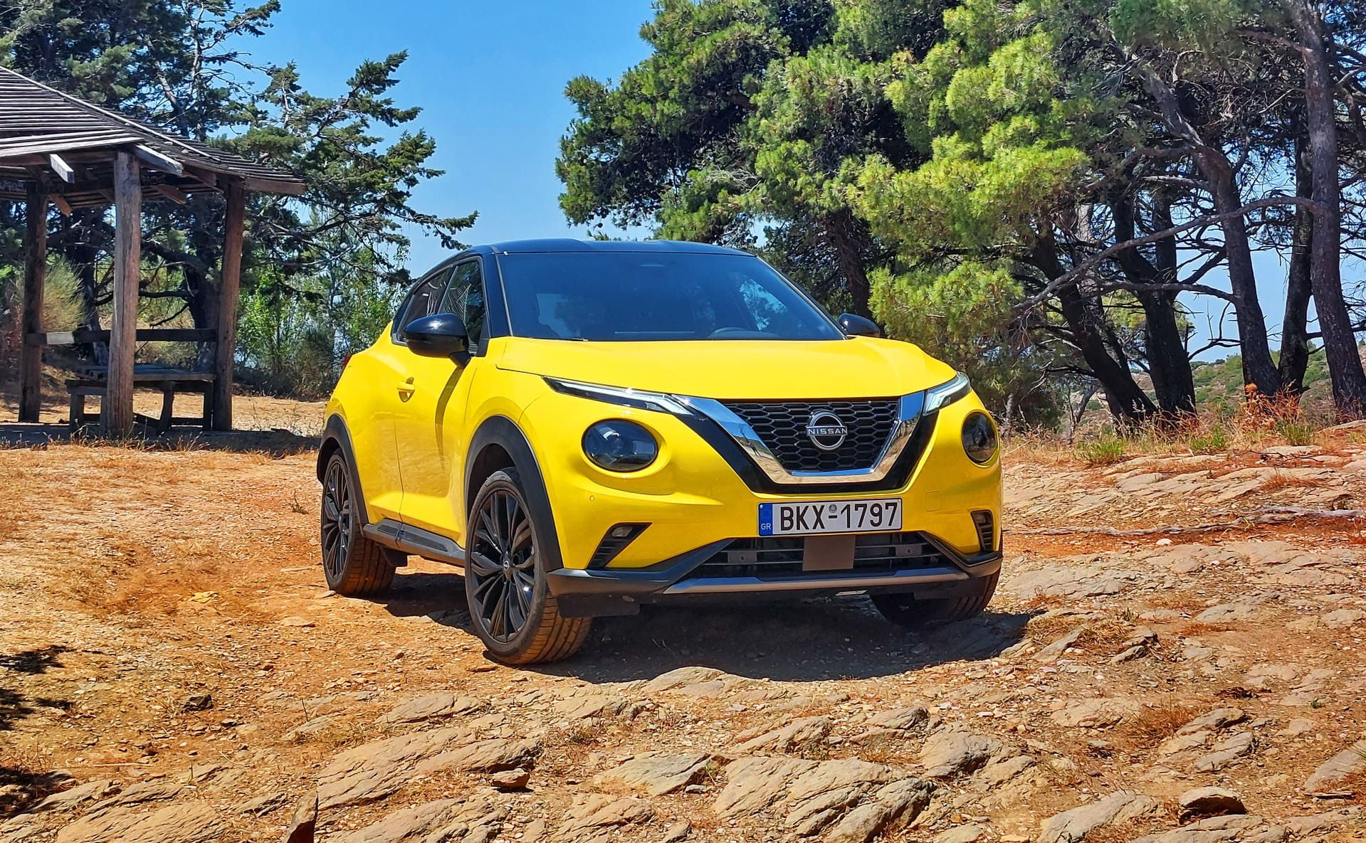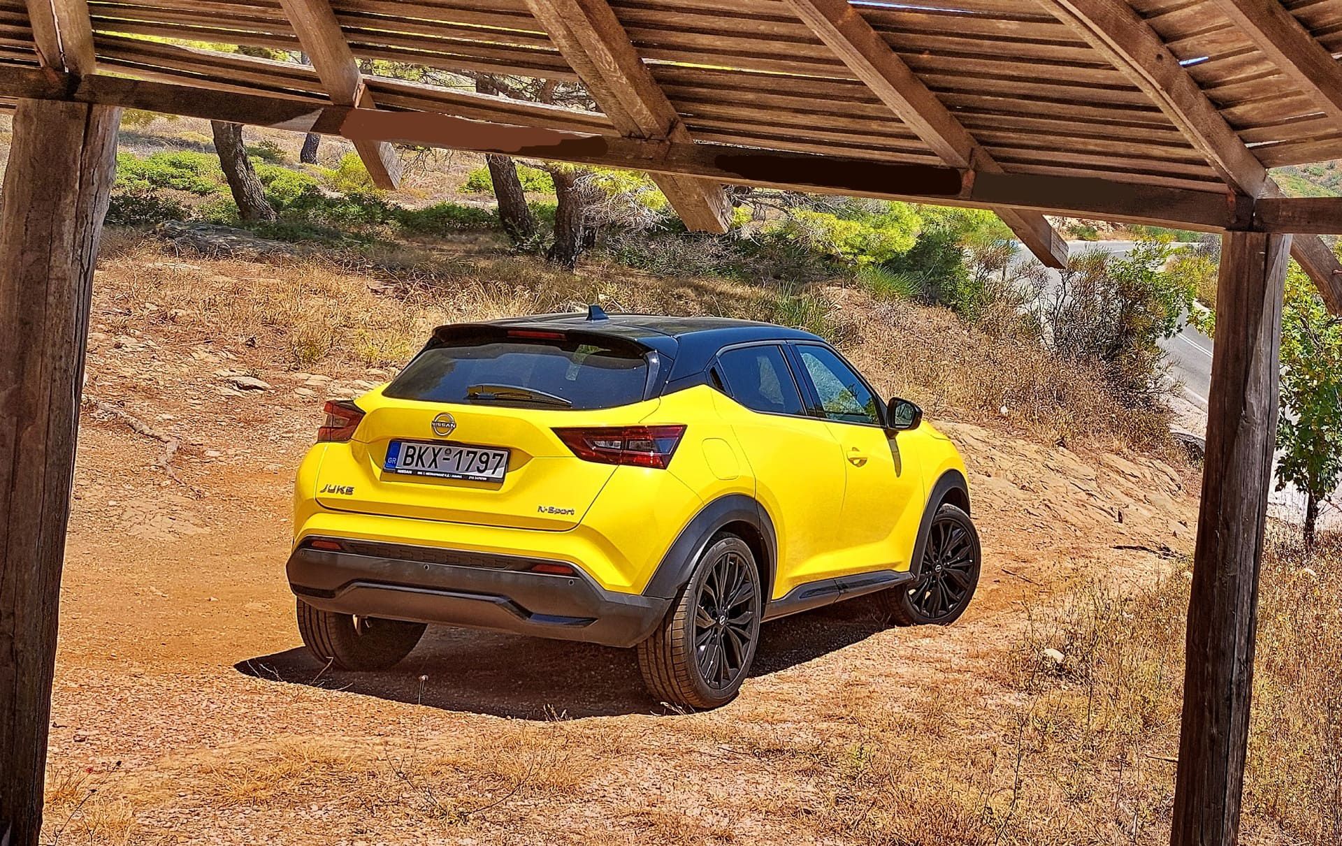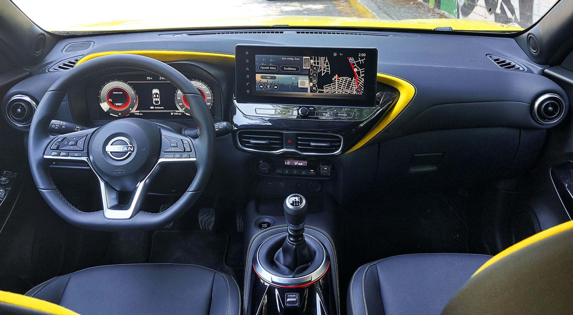 Η έντονη αντίθεση του κίτρινου με το μαύρο (σε οροφή, τροχούς, εξωτερικούς καθρέπτες και άλλα σημεία) στο επίπεδο εξοπλισμού N-Sport του αυτοκινήτου δοκιμής, δημιουργεί ένα όμορφο στο μάτι αποτέλεσμα, που χαρίζει στο Juke δυναμική εμφάνιση. Στο εσωτερικό η σημαντικότερη διαφοροποίηση του ανανεωμένου Juke είναι το πλήρως επανασχεδιασμένο ταμπλό. Πέρα από τα ένθετα σε ταμπλό και καθίσματα από αλκαντάρα σε κίτρινο χρώμα και τους επανασχεδιασμένους αεραγωγούς, έχει τοποθετηθεί νέα οθόνη αφής. Έχει διαγώνιο 12,3 ίντσες (έναντι 8 ιντσών στο προ facelift μοντέλο) και είναι ελαφρώς στραμμένη προς τον οδηγό.