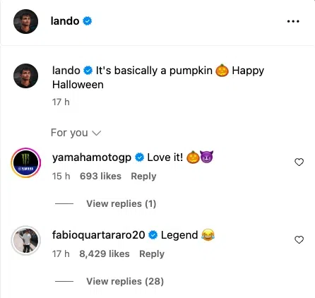 Χθες το βράδυ, ο Βρετανός πιλότος της McLaren δημοσίευσε φωτογραφίες στον λογαριασμό του στο Instagram, στις οποίες φαίνεται να φοράει την αγωνιστική φόρμα του παγκόσμιου πρωταθλητή MotoGP του 2021, Φάμπιο Κουαρταραρό.