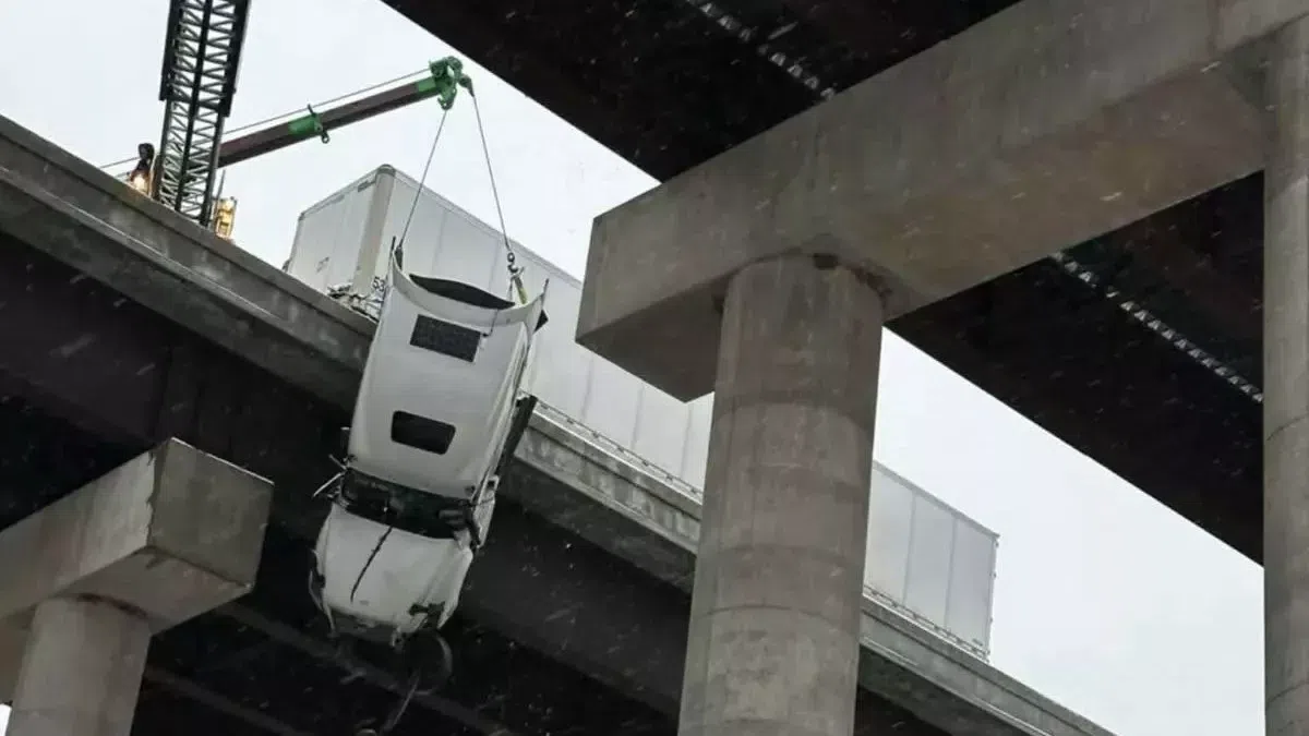 Ευτυχώς, ο οδηγός του φορτηγού απεγκλωβίστηκε παρότι έμεινε να κρέμεται από τη γέφυρα για πάνω από 5 ώρες!