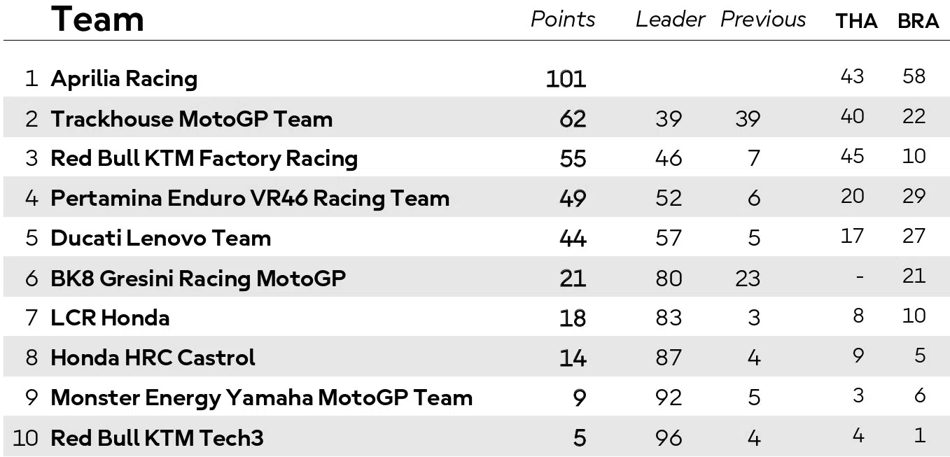 Παράλληλα, η Aprilia οδηγεί την κούρσα και στο πρωτάθλημα των ομάδων. Συγκεκριμένα η ιταλική ομάδα έχει 101 βαθμούς, ενώ την πεντάδα συμπληρώνουν η Trackhouse Aprilia (62 β.), η Red Bull KTM (55 β.), η VR46 Ducati (49 β.) και η εργοστασιακή Ducati (44 β.).