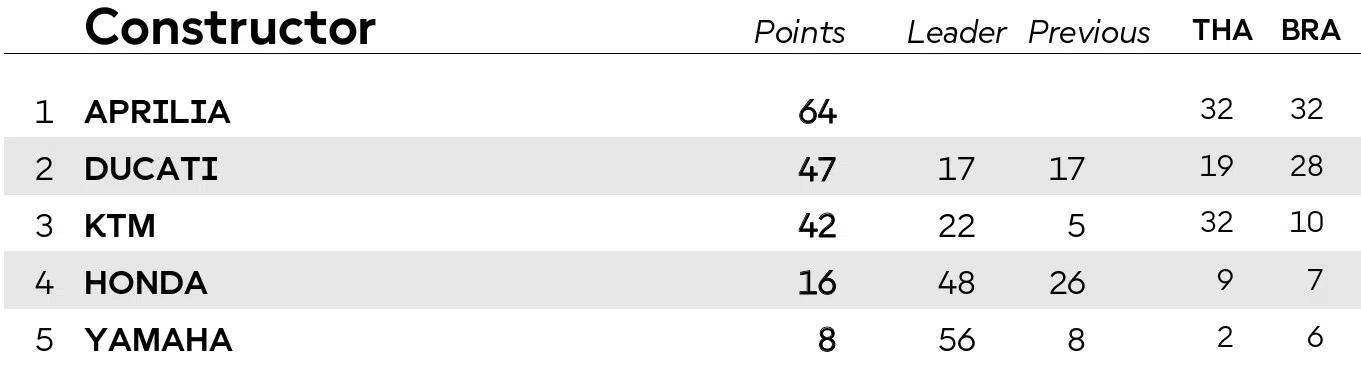 Η απόλυτη κυριαρχία της Aprilia στο GP της Βραζιλίας, με τον Μάρκο Μπετζέκι να κατακτά τη νίκη και τον Χόρχε Μάρτιν να τον ακολουθεί, έφερε σημαντικές ανακατατάξεις στις βαθμολογίες του MotoGP.