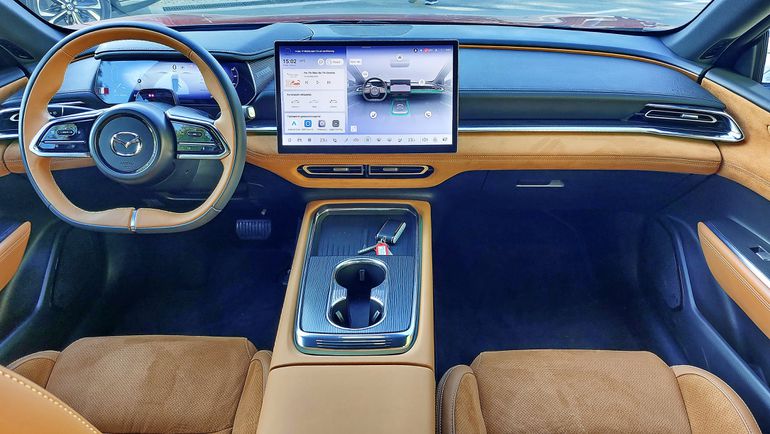 Το εσωτερικό του 6e είναι μια ακόμη απόδειξη της μαεστρίας των σχεδιαστών της Mazda. Αποπνέει μια διάχυτη αύρα πολυτέλειας την οποία συνδυάζει αρμονικά με την οδηγοκεντρική προσέγγιση που παραδοσιακά διακρίνει τα μοντέλα της μάρκας. Σε αντίθεση με ότι έχουμε συνηθίσει να βλέπουμε τελευταία από τους περισσότερους κατασκευαστές, εδώ υπάρχουν μεν οθόνες (ψηφιακός πίνακας οργάνων 10,2’’, head-up display και κεντρική οθόνη αφής 14,6’’) αλλά δεν είναι αυτές που κυριαρχούν.