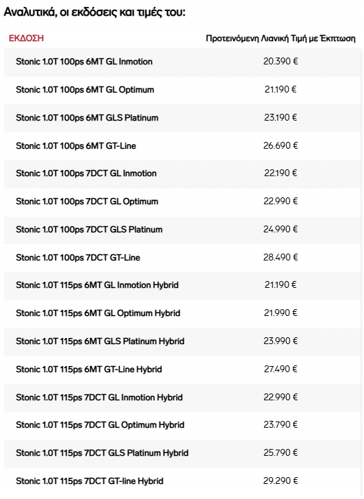 Το νέο Kia Stonic ξεκινά την πορεία του στην ελληνική αγορά με τιμή εκκίνησης τις 20.390 ευρώ, ένα κόστος στο οποίο συνυπολογίζεται έκπτωση 500 ευρώ.