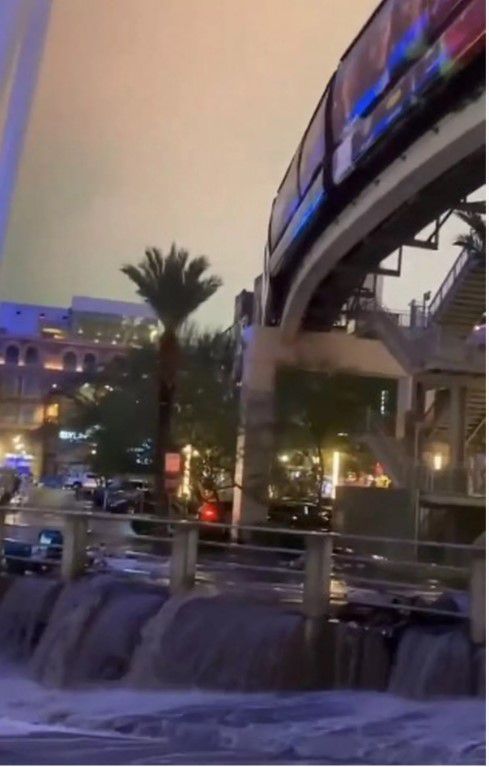 Η πόλη βρέθηκε στο έλεος της κακοκαιρίας το βράδυ της Τρίτης, με βίντεο στα μέσα κοινωνικής δικτύωσης να καταγράφουν ορμητικά νερά να διασχίζουν το πάρκινγκ του ξενοδοχείου Linq, το οποίο βρίσκεται πάνω στην κεντρική ευθεία της πίστας.