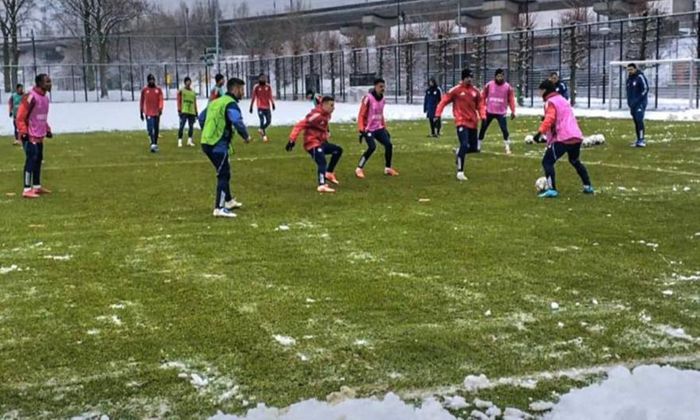 Προπόνηση για τον Ολυμπιακό στο Άμστερνταμ - Ο Μεντιλίμπαρ καθάριζε τα... χιόνια στο γήπεδο! (vid & pics)