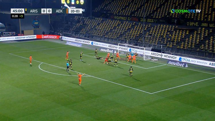 Στο πρώτο λεπτό των καθυστερήσεων του πρώτου ημιχρόνου κι έπειτα από μία εκτέλεση κόρνερ, η μπάλα στρώθηκε στον Γκατσίνοβιτς, ο οποίος εκτέλεσε υποδειγματικά για το προβάδισμα της ΑΕΚ (0-1).