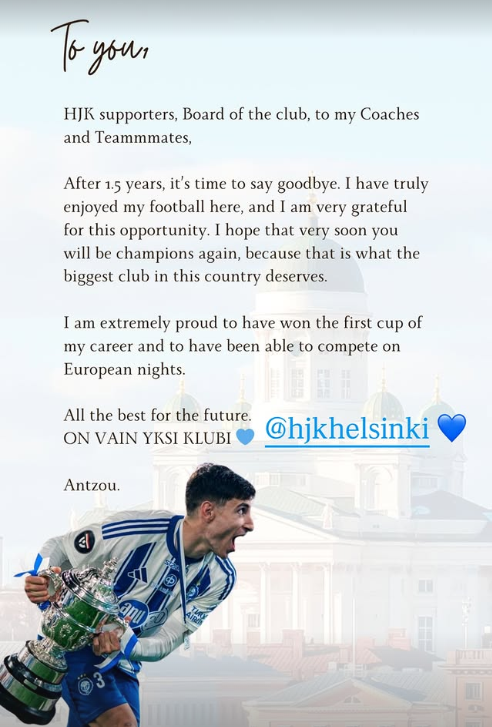 Ο Γιώργος Αντζουλάς αποχώρησε από την Ελσίνκι μετά από 1.5 χρόνο που βρισκόταν στη Φινλανδία. Ο Έλληνας αμυντικός λοιπόν θα συνεχίσει την καριέρα του στη Γερμανία, για λογαριασμό της Ίνγκολσταντ και κάπως έτσι αποχαιρέτησε την Ελσίνκι με ένα ποστ στα social media.