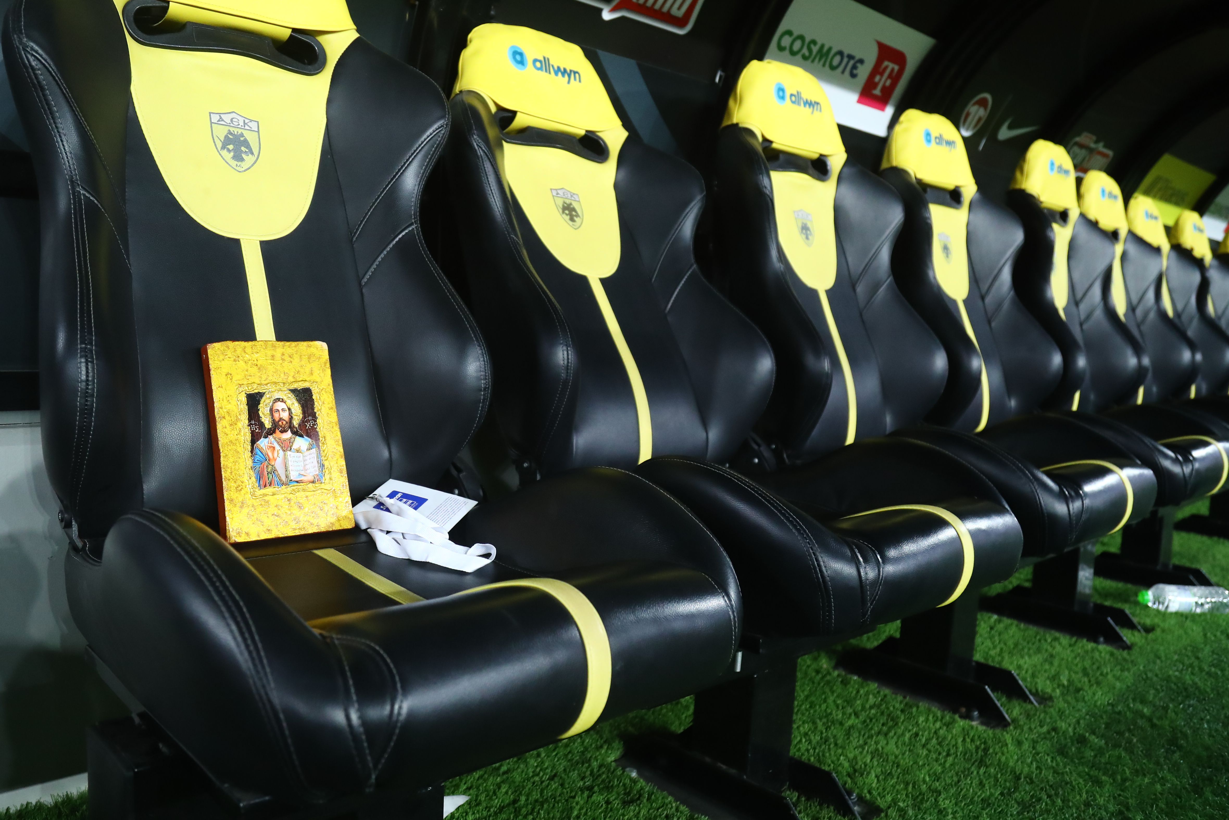 Κάποιο μέλος από την ΑΕΚ ή τον Λεβαδειακό έχει τοποθετήσει στον πάγκο της ομάδας του μια εικόνα του Χριστού.