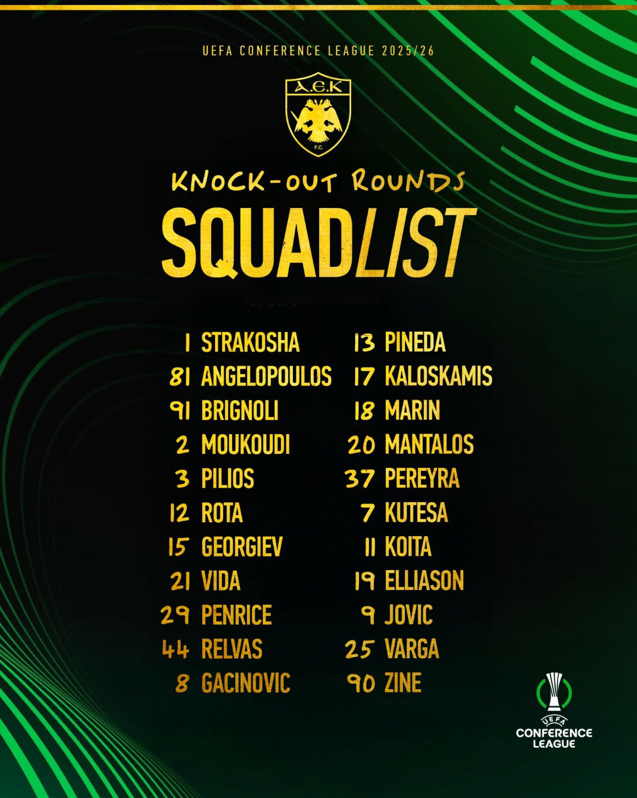 Η ΑΕΚ τελικά τις "κλείδωσε" τις τρεις αλλαγές της και έστειλε την ευρωπαϊκή της λίστα στην ΟΥΕΦΑ, λίγες ώρες πριν από τα μεσάνυχτα της Πέμπτης. Όπως αναμενόταν, ο Βάργκα πήρε την θέση του Πιερό ενώ κατά τα άλλα, ο Γκεοργκίεφ αντικαθιστά τον Γκρούγιτς, ενώ ο Καλοσκάμης παίρνει την θέση του Χρυσόπουλου.