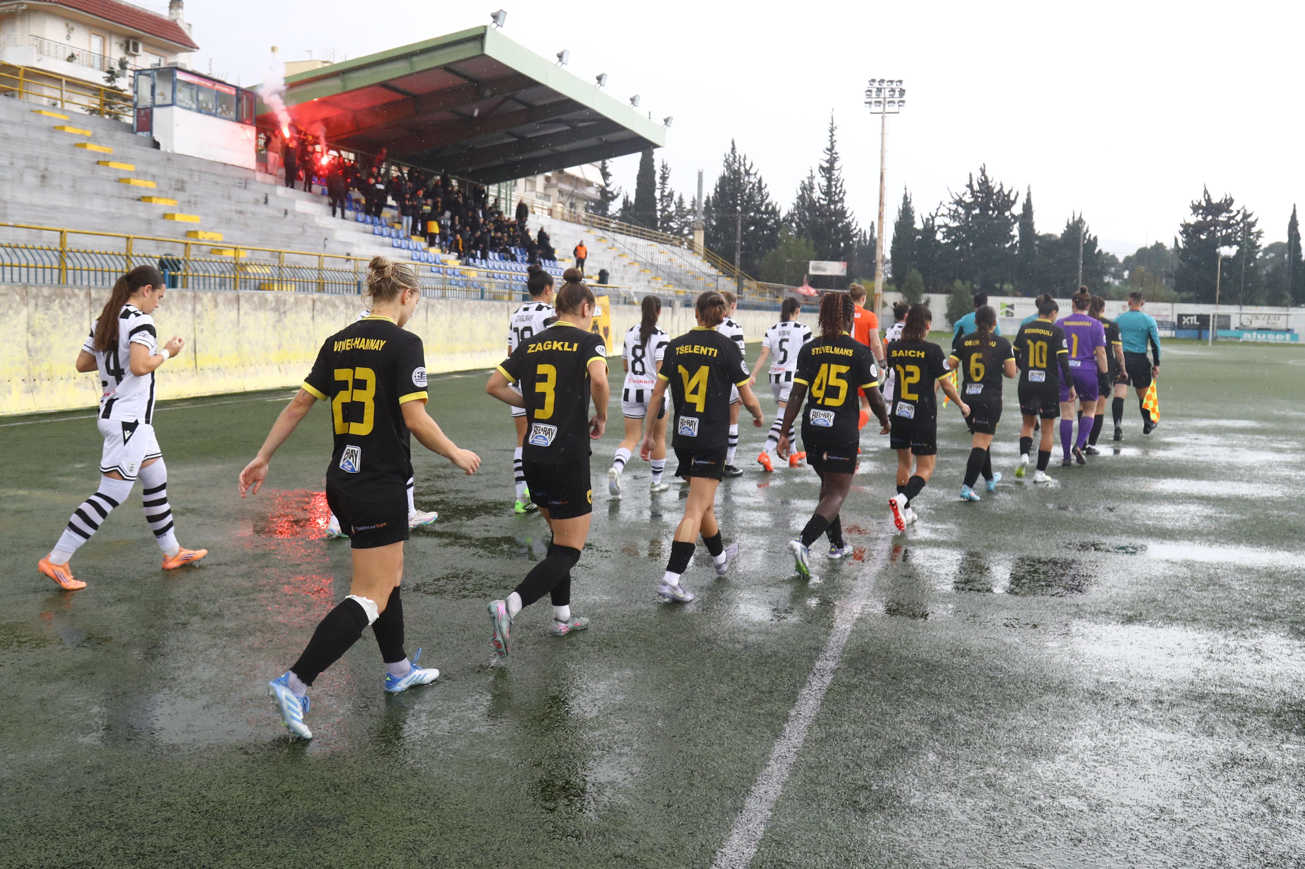 Το γήπεδο των Αγίων Αναργύρων μετατράπηκε χώρο που θύμιζε λίμνη σε πολλά σημεία. Η συνεχής και έντονη βροχόπτωση έκανε σχεδόν αδύνατη την προσπάθεια να παιχτεί ποδόσφαιρο, με τις αθλήτριες να καλούνται να δώσουν τον καλύτερό τους εαυτό κάτω από πρωτόγνωρες συνθήκες.