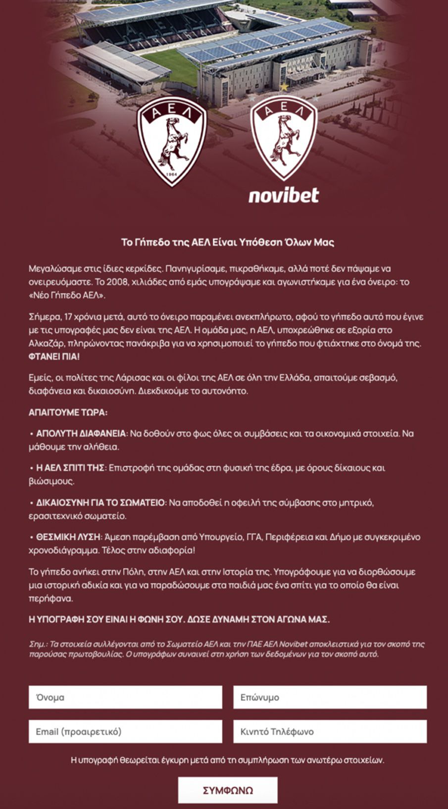 «Με το σύνθημα «Το ARENA επιστρέφει στην ΑΕΛ με την υπογραφή σου», ξεκίνησε επίσημα η μεγάλη εκστρατεία συλλογής υπογραφών για την επιστροφή του AEL FC ARENA εκεί όπου ανήκει — στον λαό της ΑΕΛ!