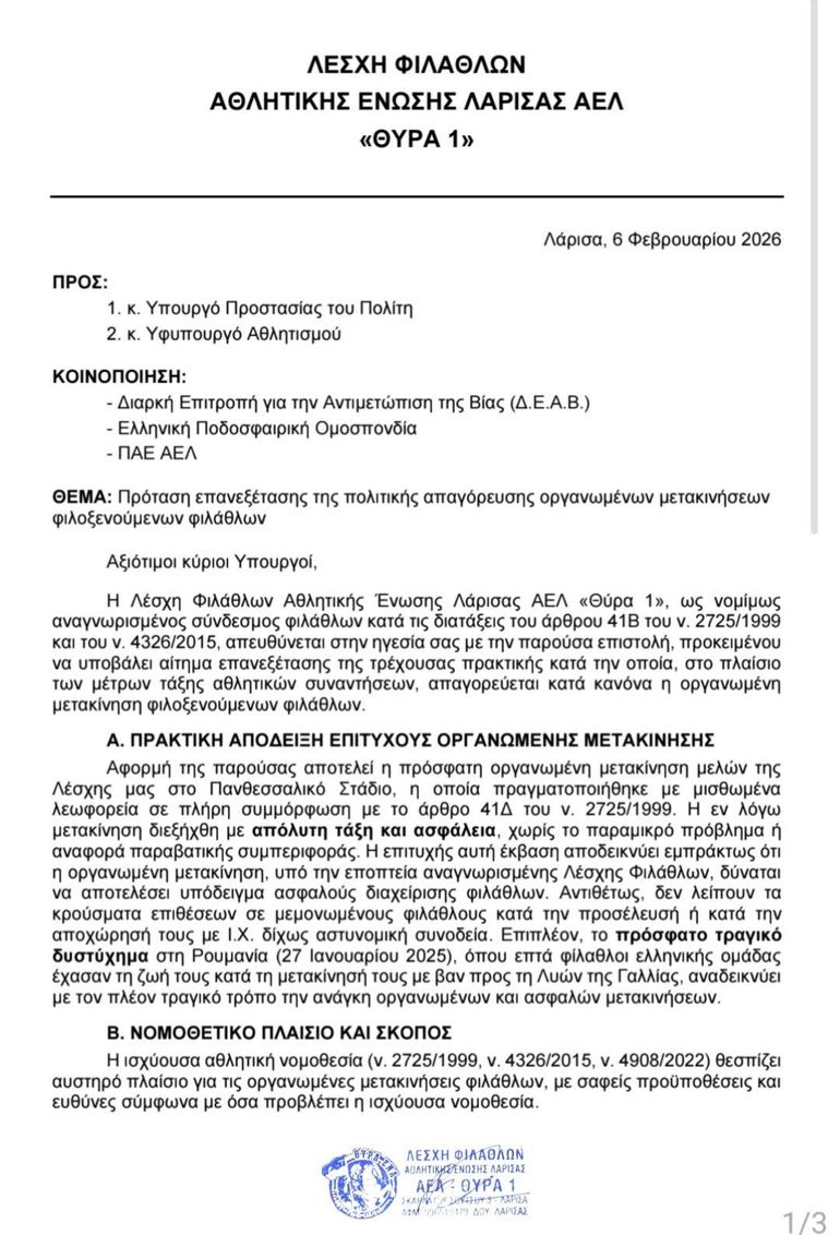 Η Λέσχη Φιλάθλων Αθλητικής Ένωσης Λάρισας ΑΕΛ «Θύρα 1», ως νομίμως αναγνωρισμένος σύνδεσμος φιλάθλων κατά τις διατάξεις του άρθρου 41Β του ν. 2725/1999 και του ν. 4326/2015, απευθύνεται στην ηγεσία σας με την παρούσα επιστολή, προκειμένου να υποβάλει αίτημα επανεξέτασης της παρούσας πρακτικής κατά την οποία στο πλαίσιο των μέτρων τάξης αθλητικών συναντήσεων, απαγορεύεται κατά κανόνα η οργανωμένη μετακίνηση φιλοξενούμενων φιλάθλων.