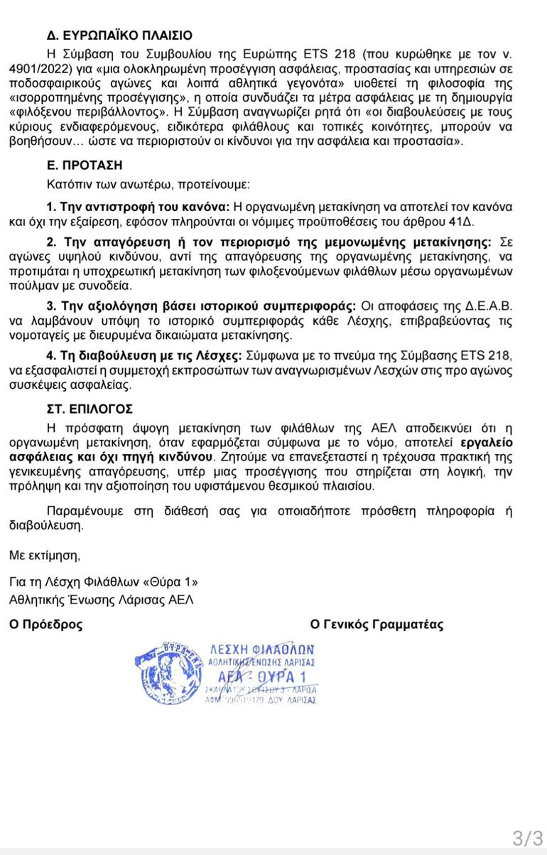 Η πρόσφατη άψογη μετακίνηση των φιλάθλων της ΑΕΛ αποδεικνύει ότι η οργανωμένη μετακίνηση, όταν εφαρμόζεται σύμφωνα με το νόμο, αποτελεί εργαλείο ασφάλειας και όχι πηγή κινδύνου. Ζητούμε να επανεξεταστεί η παρούσα πρακτική της γενικευμένης απαγόρευσης, υπέρ μιας προσέγγισης που στηρίζεται στη λογική, την πρόληψη και την αξιοποίηση του υφιστάμενου θεσμικού πλαισίου.