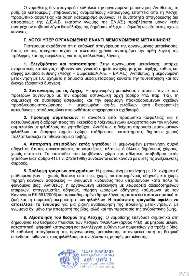 Αφορμή της παρούσας αποτελεί η πρόσφατη οργανωμένη μετακίνηση μελών της Λέσχης μας στο Πανθεσσαλικό Στάδιο, η οποία πραγματοποιήθηκε με μισθωμένα λεωφορεία σε πλήρη συμμόρφωση με το άρθρο 41Δ του ν. 2725/1999. Η εν λόγω μετακίνηση διεξήχθη με απόλυτη τάξη και ασφάλεια, χωρίς το παραμικρό περιστατικό ή αναφορά παραβατικής συμπεριφοράς. Η επιτυχής αυτή έκβαση αποδεικνύει εμπράκτως ότι η οργανωμένη μετακίνηση, υπό την εποπτεία αναγνωρισμένης Λέσχης Φιλάθλων, δύναται να αποτελέσει υπόδειγμα ασφαλούς διαχείρισης φιλάθλων. Αντιθέτως, δεν λείπουν τα κρούσματα επεισοδίων μεμονωμένων φιλάθλων κατά τη προσέλευσή τους ή κατά την αποχώρησή τους με Ι.Χ. δίχως αστυνομική συνοδεία. Επιπλέον, το πρόσφατο τραγικό δυστύχημα στη Ρουμανία (27 Ιανουαρίου 2025), όπου επτά φίλαθλοι ελληνικής ομάδας έχασαν τη ζωή τους κατά τη μετακίνησή τους με βαν προς τη πόλη της Γαλλίας, αναδεικνύει με τον πλέον τραγικό τρόπο την ανάγκη οργανωμένων και ασφαλών μετακινήσεων.