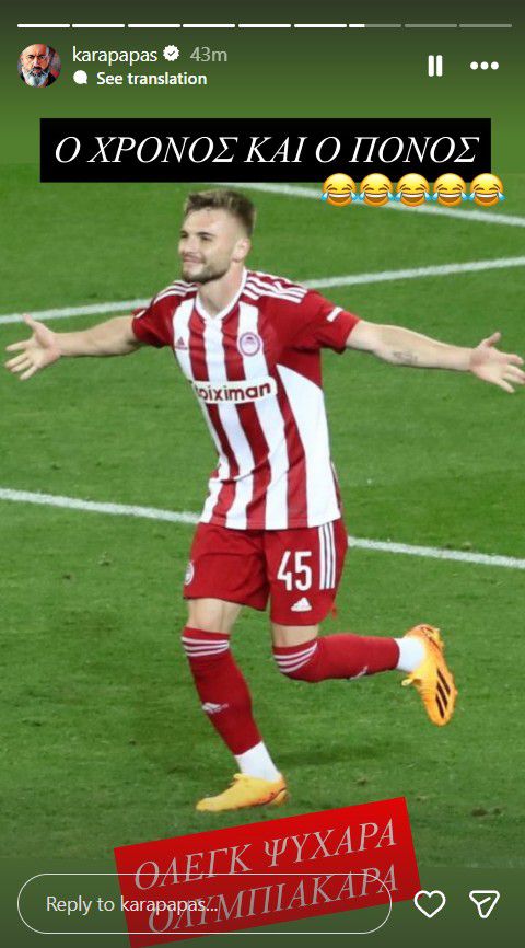 O ισχυρός άνδρας των Πειραιωτών αφενός ανέβασε μία φωτογραφία του Όλεγκ Ρέαμπτσουκ και τον πανηγυρισμό του στο Ολυμπιακός - Παναθηναϊκός, τη χρονιά που κρίθηκε στο ντέρμπι αιωνίων το πρωτάθλημα. Μάλιστα τη συνόδευσε με τη λεζάντα: «Ο χρόνος και ο πόνος. Όλεγκ ψυχάρα Ολυμπιακάρα».