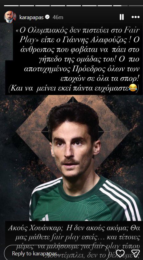 Ακολούθησε η επόμενη εικόνα με τον Χουάνκαρ, στην οποία ο αντιπρόεδρος της ΠΑΕ Ολυμπιακός έγραψε πως: «"Ο Ολυμπιακός δεν πιστεύει στο Fair Play" είπε ο Γιάννης Αλαφούζος! Ο άνθρωπος που φοβάται να πάει στο γήπεδο της ομάδας του! Ο πιο αποτυχημένος Πρόεδρος όλων των εποχών σε όλα τα σπορ (και να μείνει εκεί πάντα ευχόμαστε).