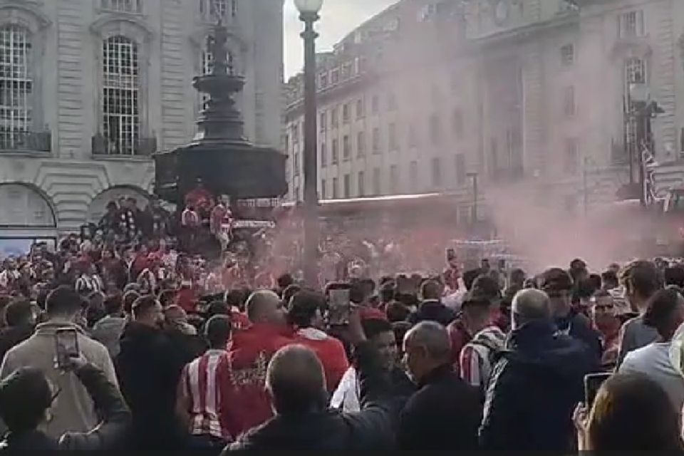 Οι φίλοι των Ερυθρολεύκων πριν από την αναμέτρηση με την Άρσεναλ, συγκεντρώθηκαν στην Piccadilly Square, το οποίο... έβαψαν κόκκινο με συνθήματα και κασκόλ.