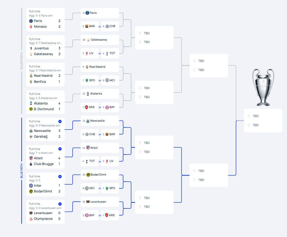 Αρχικά την Τρίτη (24/02) «τσέκαραν» το εισιτήριο τους οι Ατλέτικο Μαδρίτης, Νιουκάστλ, Λεβερκούζεν και Μπόντο Γκλιμτ, ενώ την Τετάρτη (25/02) σειρά πήραν οι Ρεάλ Μαδρίτης, Παρί Σεν Ζερμέν, Αταλάντα και Γαλατασαράι μετά από φοβερά παιχνίδια γεμάτα γκολ και θέαμα.