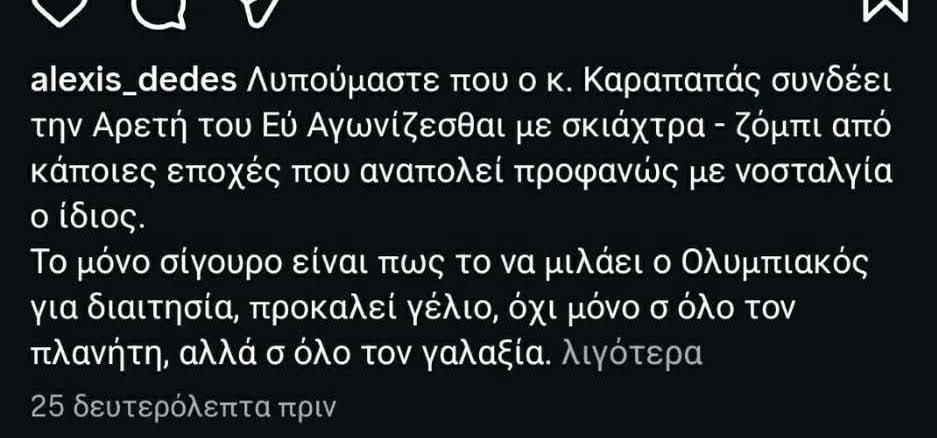 «Λυπούμαστε που ο κ. Καραπαπάς συνδέει την Αρετή του Εύ Αγωνίζεσθαι με σκιάχτρα - ζόμπι από κάποιες εποχές που αναπολεί προφανώς με νοσταλγία ο ίδιος. Το μόνο σίγουρο είναι πως το να μιλάει ο Ολυμπιακός για διαιτησία, προκαλεί γέλιο, όχι μόνο σ όλο τον πλανήτη, αλλά σ όλο τον γαλαξία».
