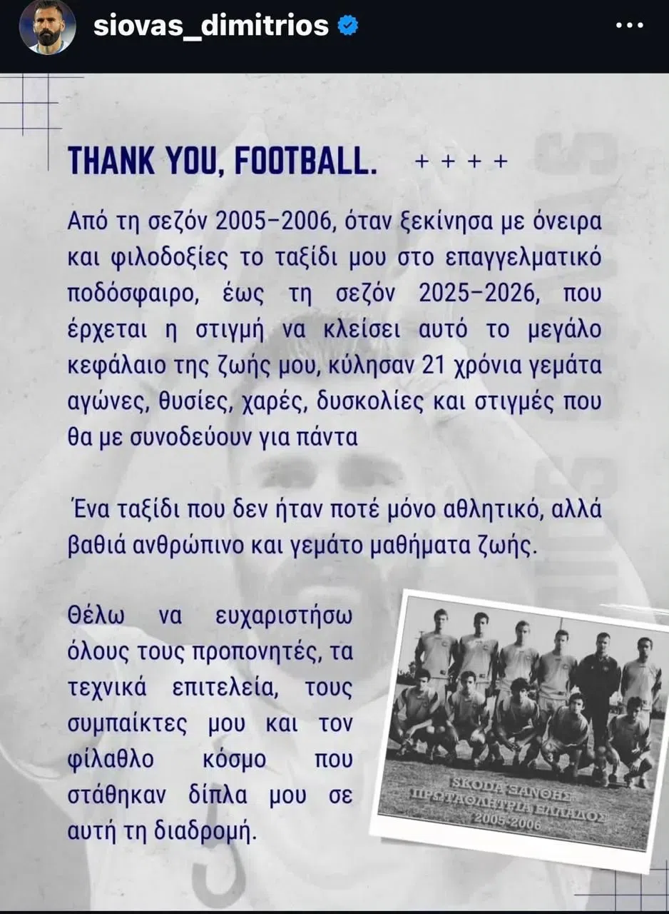 Από τη σεζόν 2005-2006, όταν ξεκίνησα με όνειρα και φιλοδοξίες το ταξίδι μου στο επαγγελματικό ποδόσφαιρο, έως τη σεζόν 2025-2026, που έρχεται η στιγμή να κλείσει αυτό το μεγάλο κεφάλαιο της ζωής μου, κύλησαν 21 χρόνια γεμάτα αγώνες, θυσίες, χαρές, δυσκολίες και στιγμές που θα με συνοδεύουν για πάντα.