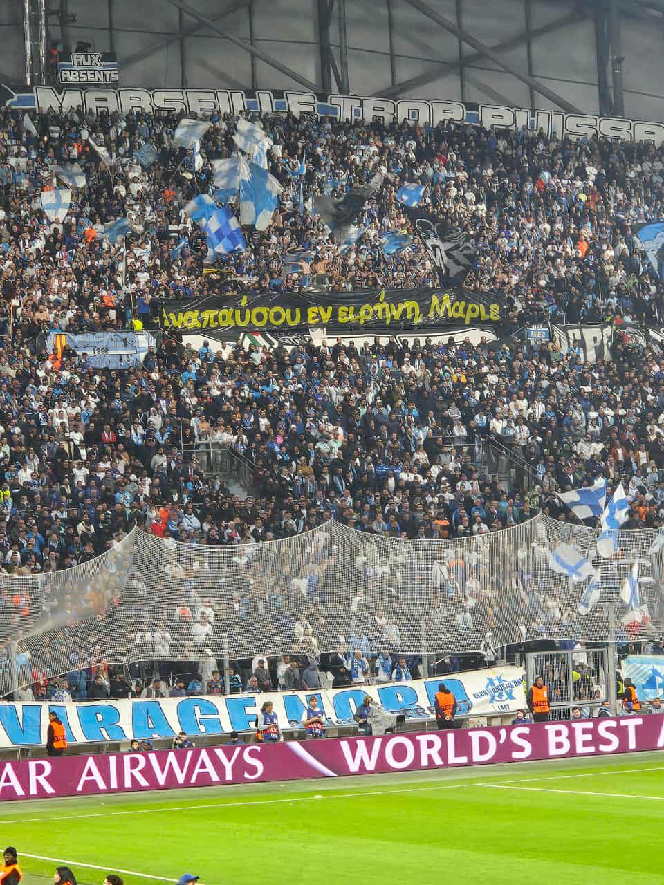 Στο «Βελοντρόμ» οι φίλοι της Μαρσέιγ σήκωσαν δύο πανό, προκειμένου να τιμήσουν τη μνήμη του 20χρονου οπαδού της ΑΕΚ, Μάριου, που δολοφονήθηκε στη Χαλκίδα.
