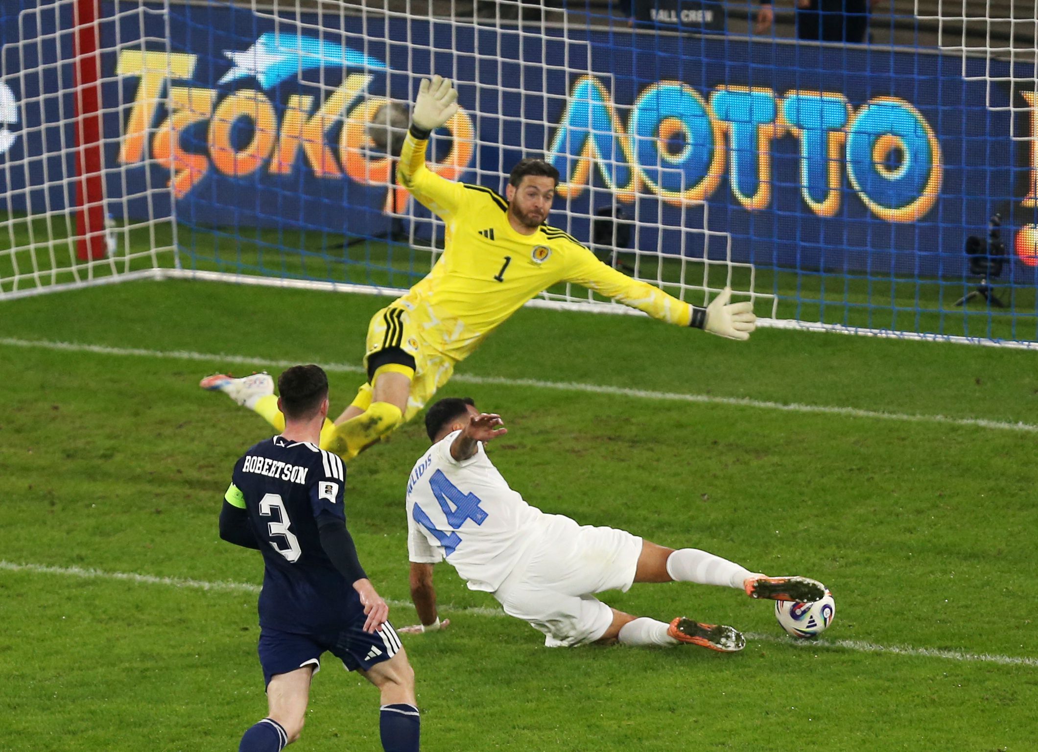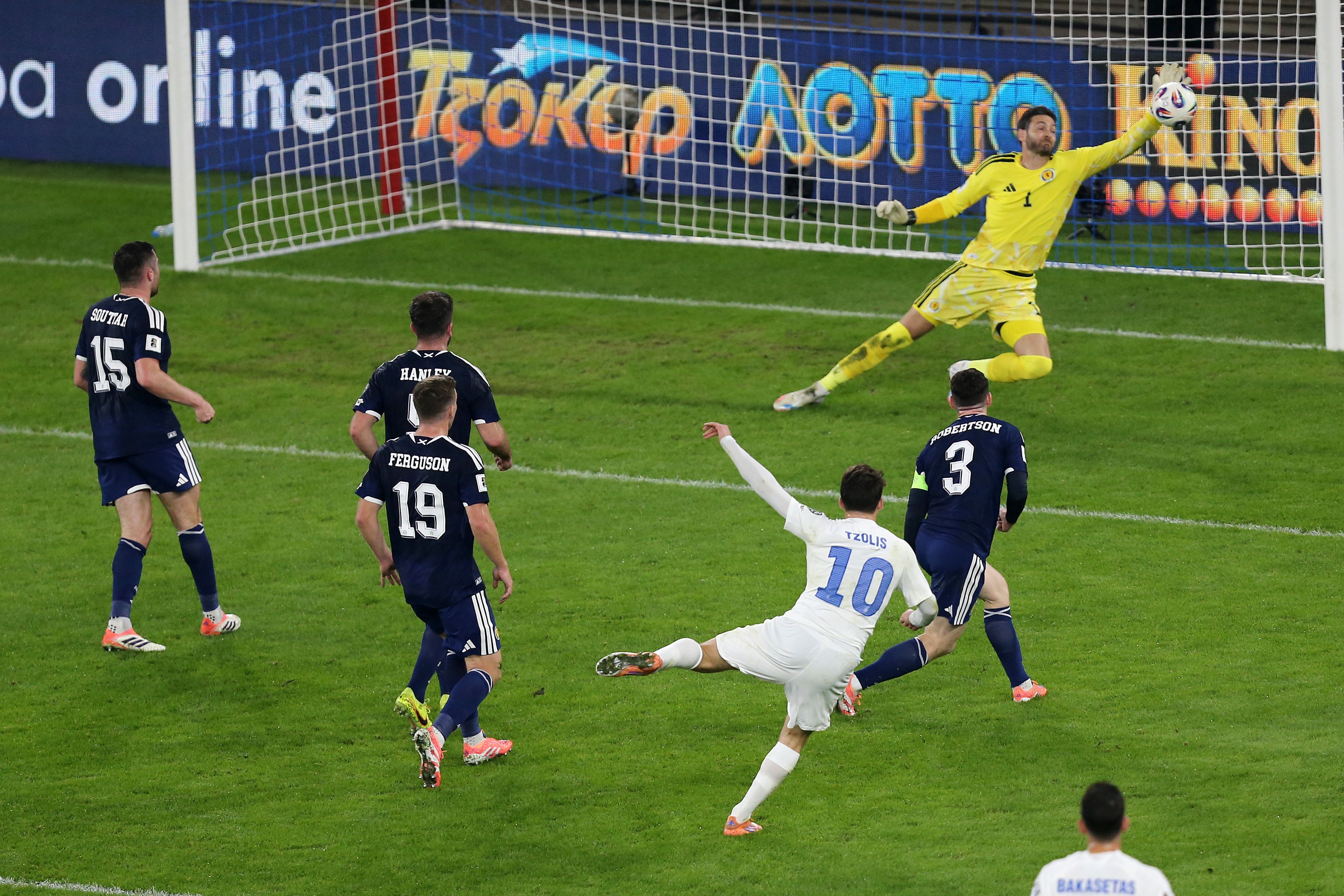 Η Σκωτία απείλησε ξανά στις καθυστερήσεις του πρώτου ημιχρόνου με τον Σκοτ ΜακΤόμινι να σημαδεύει το δοκάρι της εστίας του Οδυσσέα Βλαχοδήμου και το 1-0 να παραμένει. Στο 45+2' μετά από σέντρα του Χίκι, ο Άνταμς σημάδεψε με κεφαλιά, την εξωτερική πλευρά των διχτυών. Λίγο πριν την ανάπαυλα ο τερματοφύλακας της Εθνικής σταμάτησε και το σουτ του Ντόακ σε τετ-α-τετ διατηρώντας το σκορ ως είχε.