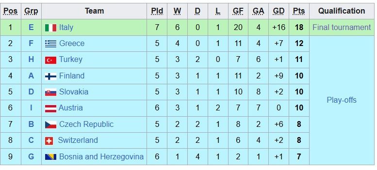 Έτσι για να κόψει πρώτη το νήμα του group θα πρέπει στα εναπομείναντα τρία παιχνίδια του να πάρει έστω έναν πόντο περισσότερο από τη Γερμανία. Ωστόσο στην τελική φάση του τουρνουά δεν περνούν μόνο οι πρώτοι των εννέα προκριματικών ομίλων αλλά και η καλύτερη δεύτερη εξ' αυτών, ενώ οι υπόλοιποι οκτώ θα παίξουν μπαράζ για να συμπληρωθεί το παζλ των 16 συμμετεχόντων (2 οι διοργανωτές+9 οι πρώτοι+1 η καλύτερη 2η + 4 που θα προκύψουν από τα μπαράζ).