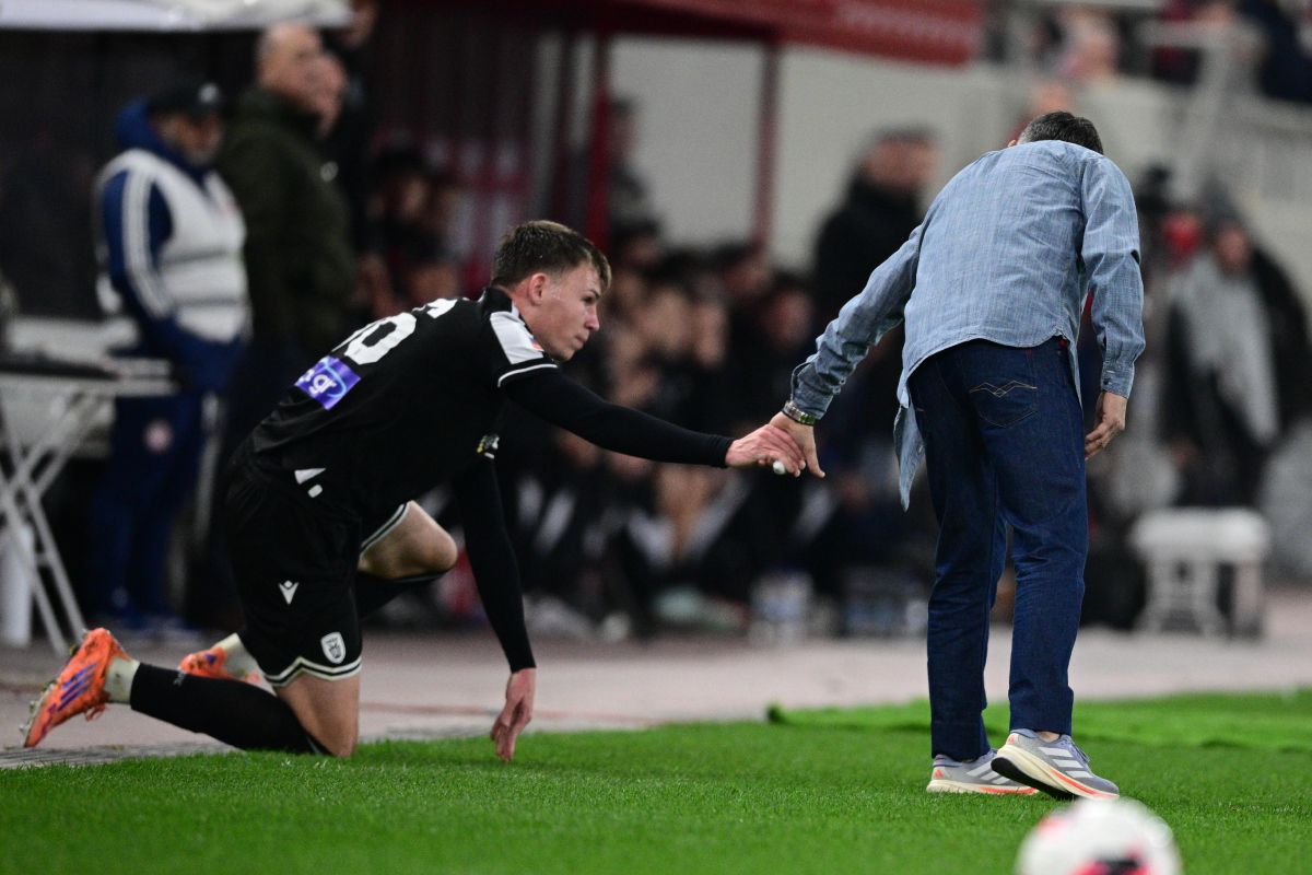 Ο νεαρός φορ του Δικεφάλου βγήκε εκτός αγωνιστικού χώρου στην προσπάθειά του να προλάβει την μπάλα, με τον τεχνικό των Πειραιωτών να του δίνει το χέρι για να σηκωθεί και να επιστρέψει και πάλι μέσα στο γήπεδο.