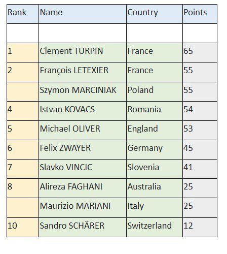 Η Γαλλία κυριάρχησε στις δύο πρώτες θέσεις, καθώς ο Τουρπέν άφησε πίσω του τον συμπατριώτη του, Φρανσουά Λετεξιέ, ο οποίος μοιράστηκε τη δεύτερη θέση με τον Πολωνό Σίμον Μαρτσίνιακ, με αμφότερους να συγκεντρώνουν 55 βαθμούς. Πολύ κοντά ακολούθησε ο Ρουμάνος Ίστβαν Κόβατς με 54 βαθμούς, ενώ την πρώτη πεντάδα έκλεισε ο Άγγλος Μάικλ Όλιβερ με 53.