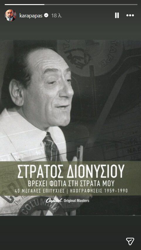 Μία ανάρτηση με αναφορά στον Στράτο Διονυσίου και το τραγούδι «Βρέχει φωτιά στη στράτα μου» έκανε ο αντιπρόεδρος της ΠΑΕ Ολυμπιακός, Κώστας Καραπαπάς.