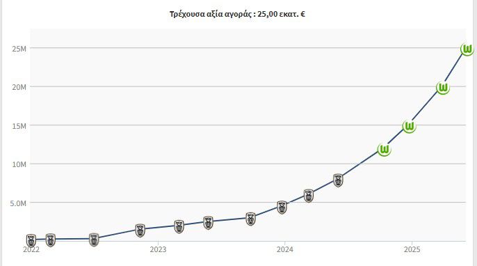 Η «εκτόξευσή» του δεν αφορά ωστόσο μόνο το αγωνιστικό κομμάτι, αλλά και τη χρηματιστηριακή του αξία, η οποία σύμφωνα πάντα με το έγκυρο transfermarkt υπολογίζεται πλέον στα 25 εκατομμύρια ευρώ.