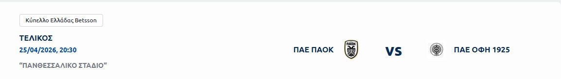 Αυτή είναι η ώρα διεξαγωγής του τελικού του Κυπέλλου Ελλάδας ανάμεσα σε ΟΦΗ και ΠΑΟΚ, όπως έκανε γνωστό η ΕΠΟ, με την αναμέτρηση να φιλοξενείται στο Πανθεσσαλικό Στάδιο.