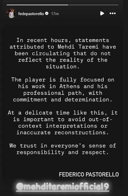 «Δεν έχουν καμία βάση και σχέση με την πραγματικότητα όσα έχουν βγει όσον αφορά τον Μεχντί Ταρέμι. Ο παίκτης είναι focus στη δουλειά του στην Αθήνα και στο επαγγελματικό του μονοπάτι», ανέφερε χαρακτηριστικά στην ανάρτησή του.