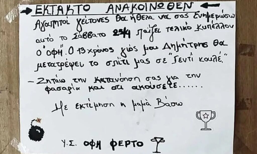 Ένα χιουμοριστικό σημείωμα μιας μητέρας προς τους γείτονές της, ενόψει του τελικού Κυπέλλου Ελλάδας μεταξύ ΟΦΗ και ΠΑΟΚ, έχει γίνει viral, αποτυπώνοντας την αγωνία και το πάθος για τον αγώνα.