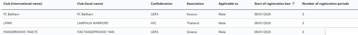 Μάλιστα το ban αναρτήθηκε και στην ιστοσελίδα της FIFA με ημέρα έναρξης τη σημερινή (8/1) και εφόσον δεν διευθετηθεί θα αφορά τρεις μεταγραφικές περιόδους.