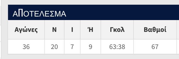 Σε σύνολο 36 αγώνων, ο απολογισμός του είναι εντυπωσιακός, με 20 νίκες, 7 ισοπαλίες και μόλις 9 ήττες, ενώ η διαφορά τερμάτων είναι 63 υπέρ και 38 κατά.