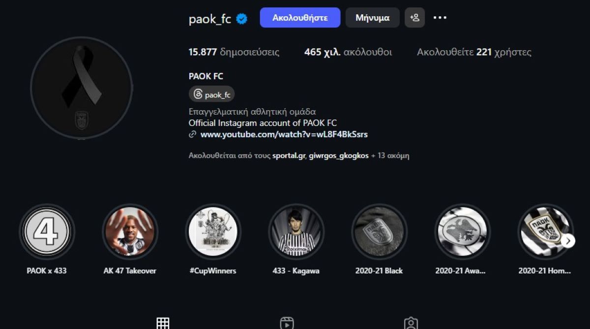 Η ΠΑΕ ΠΑΟΚ μετά το μοιραίο δυστήχμα έντυσε με μαύρη κορδέλα το έμβλημα του στα social media.