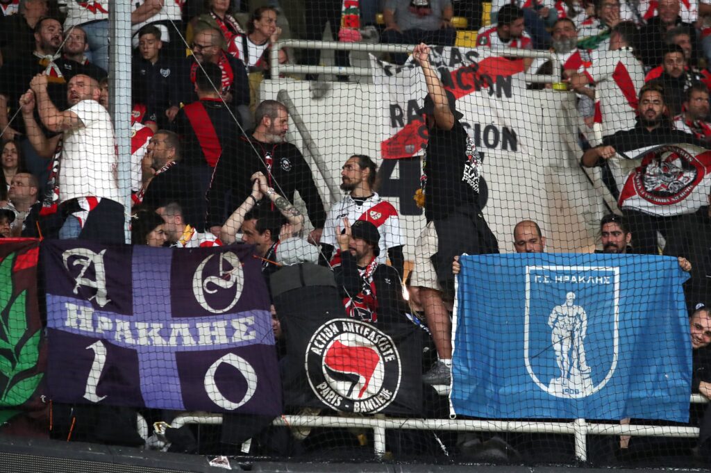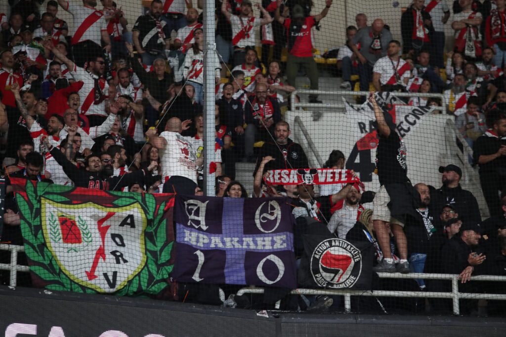 Οι φίλοι της Ράγιο Βαγιεκάνο πήραν θέση στις κερκίδες της «Allwyn Arena» για το παιχνίδι με την ΑΕΚ και σήκωσαν πανό και σημαίες του Ηρακλή.