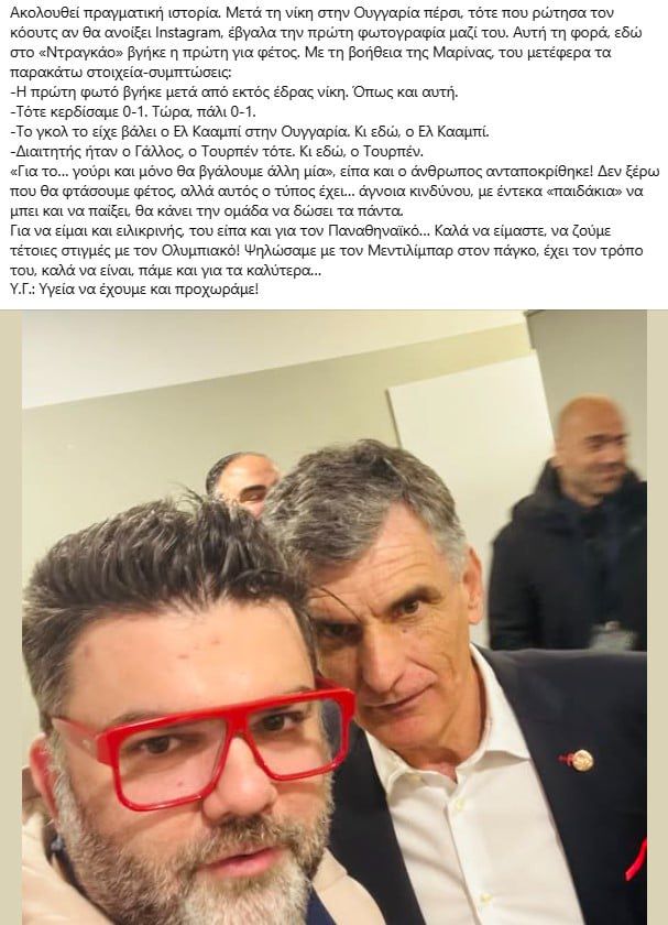 Τότε μέσω της βοήθειας της μεταφράστριας του Ολυμπιακού, Μαρίνας, ο Διονύσης Βερβελές είπε στον Μεντιλίμπαρ μερικές συμπτώσεις από την περσινή τους φωτογραφία μαζί με τη φετινή. Πιο αναλυτικά, πέρσι η φωτογραφία είχε γίνει μετά από εκτός έδρας νίκη με 1-0 κόντρα στη Φερεντσβάρος. Όπως και το βράδυ της Πέμπτης (23/1) όπου οι Ερυθρόλευκοι νίκησαν με 1-0 εκτός έδρας την Πόρτο.
