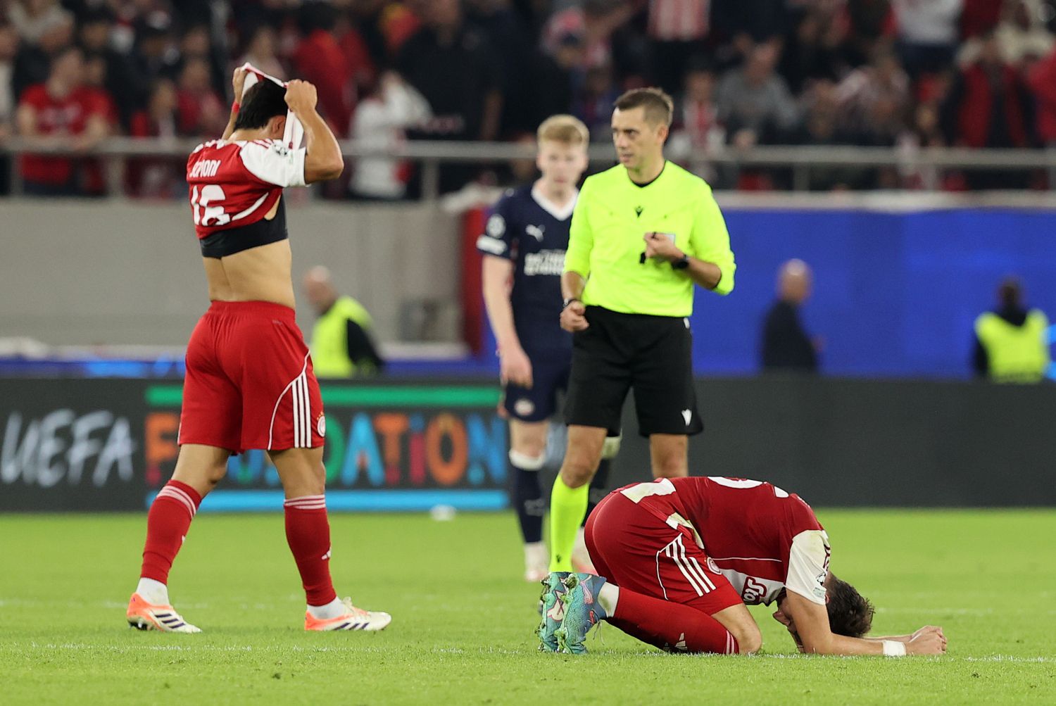 Οι ποδοσφαιριστές του Ολυμπιακού έδειχναν να μην μπορούν να πιστέψουν το πώς δεν κατάφεραν να κερδίσουν την Αϊντχόφεν