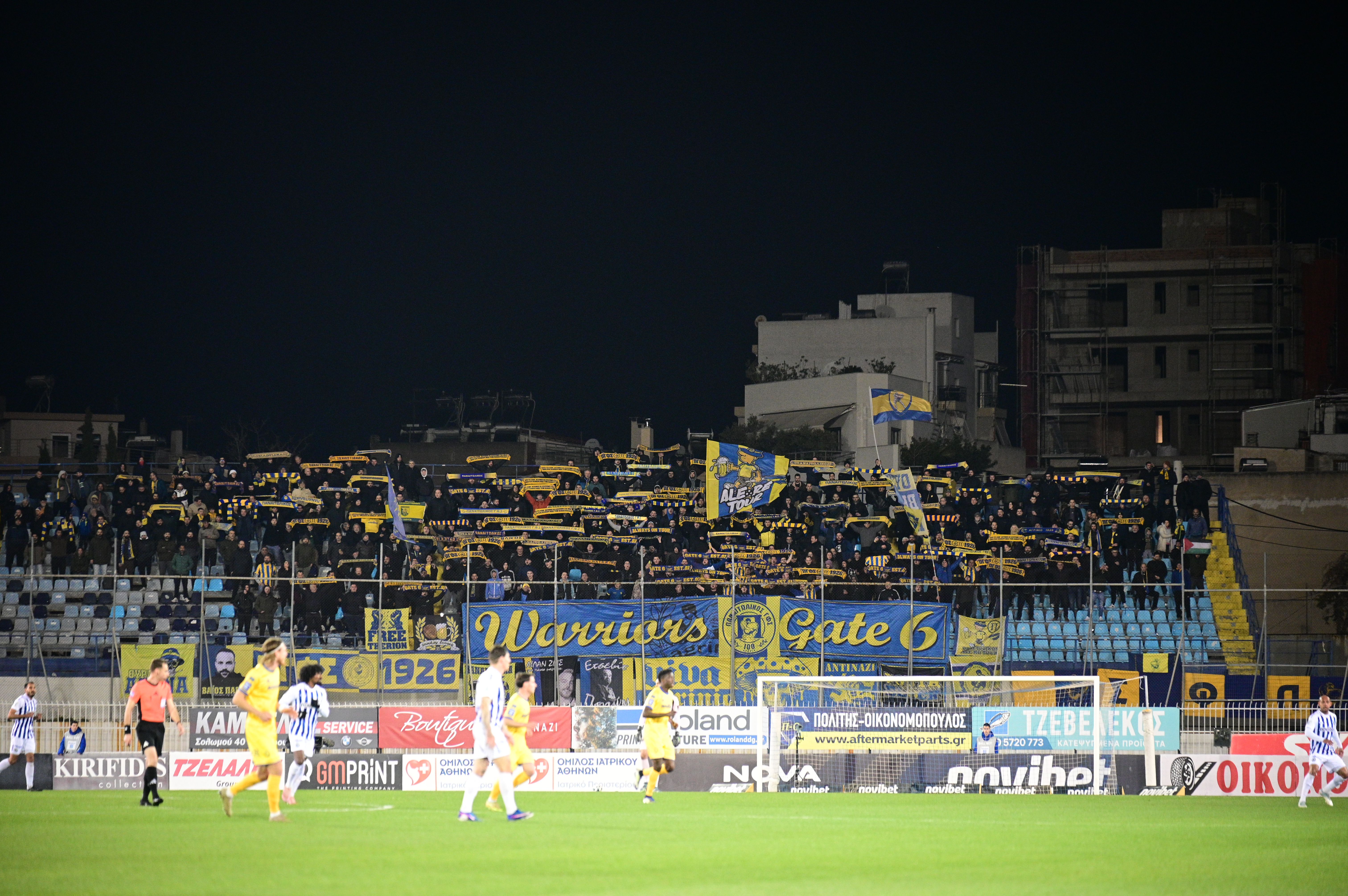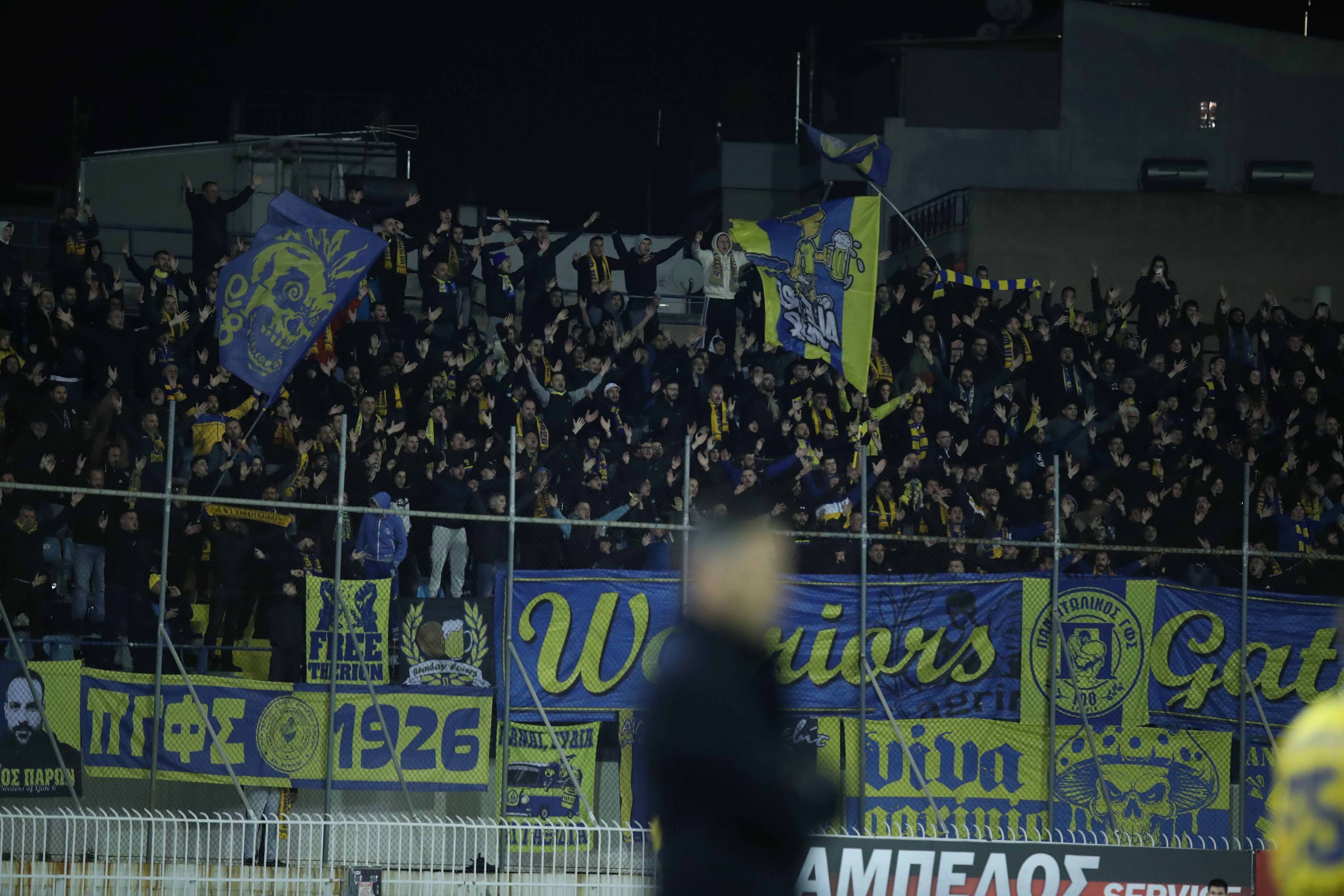 Με συνθήματα και πανό, οι φίλοι του Παναιτωλικού έδωσαν τον παλμό, δημιουργώντας εξαιρετική ατμόσφαιρα για να στηρίξουν την ομάδα τους σε αυτή την εκτός έδρας αναμέτρηση.