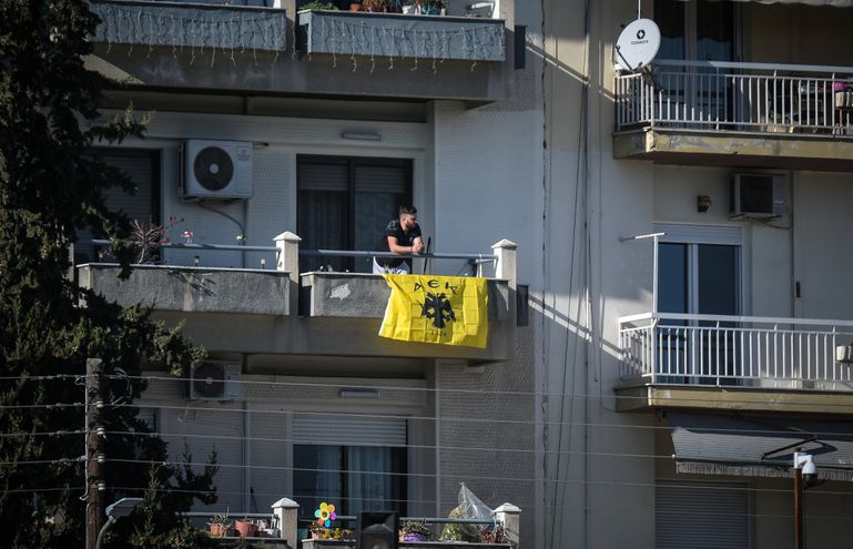 Μια ξεχωριστή εικόνα από το γήπεδο του Πανσερραϊκού φίλαθλος της ΑΕΚ παρακολούθησε την αναμέτρηση της 20ής αγωνιστικής από μπαλκόνι πολυκατοικίας