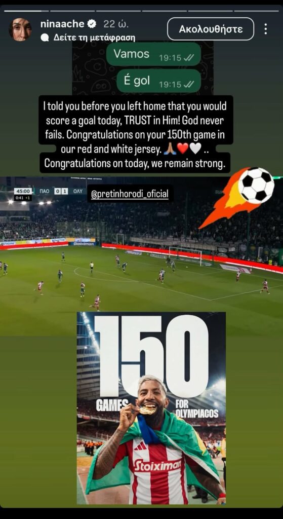 «Σου το είπα πριν φύγεις από το σπίτι ότι θα βάλεις γκολ σήμερα. Να έχεις πίστη. Ο Θεός δεν απογοητεύει ποτέ. Συγχαρητήρια για το 150ό σου παιχνίδι και για τη νίκη