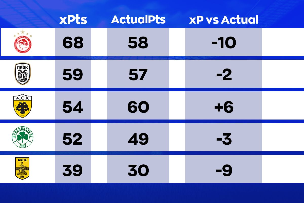 Αυτή θα έπρεπε να είναι η βαθμολογία με βάση τα xGoals με δεδομένο πως ο Ολυμπιακός ήταν καλύτερος σχεδόν σε όλα τα παιχνίδια τα με βάση το xGDifference. Οι μεγάλες διαφορές εμφανίζονται στην ομάδα του Χοσέ Λουίς Μεντιλίμπαρ που με βάση τις επιδόσεις της θα έπρεπε να έχει πάρει 10 βαθμούς περισσότερους σε σχέση με αυτούς που έχει μαζέψει στην βαθμολογία της Stoiximan Super League. Τεράστια διαφορά και στη βαθμολογία του Άρη που έχει μαζέψει 9 βαθμούς λιγότερους, ενώ η ΑΕΚ έχει 6 βαθμούς περισσότερους.
