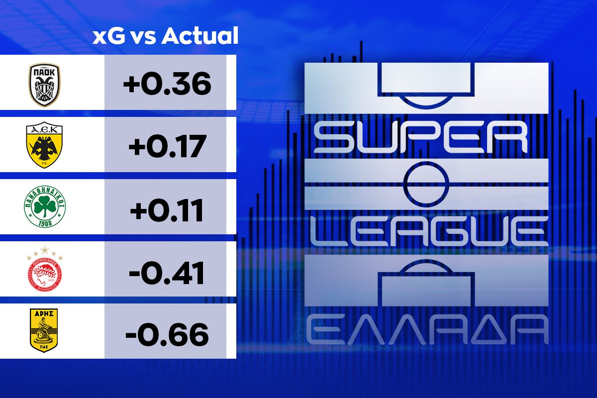 Από την άλλη, η ΑΕΚ καταφέρνει να καμουφλάρει το γεγονός πως βρίσκεται πιο χαμηλά στα xGoals, αφού στη διαφορά μεταξύ των xG vs Actual goals έχει καλύτερο συντελεστή από τους «ερυθρόλευκους», όπως ακριβώς συμβαίνει και με τον ΠΑΟΚ.